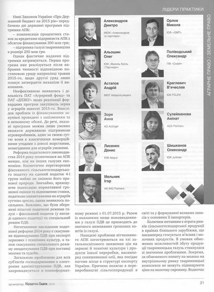 Ms. Suleymanova was acknowledged and recommended as one of the leading Ukrainian lawyers in agriculture and land legal practices.